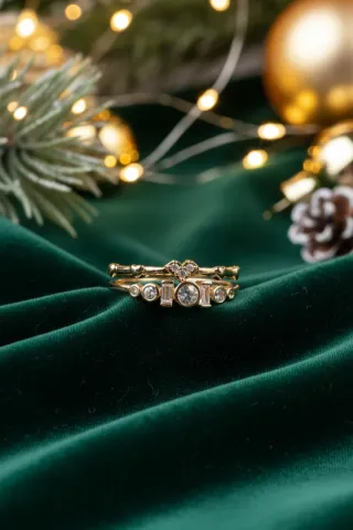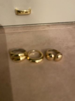 Conjunto de anillos dorados con un diseño moderno. - Diseño tipo bala. - Acabado brillante.