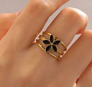 Ideal anillo de acero quirúrgico con un elegante motivo de flor en esmalte negro. 🌼 Talla ajustable 🌼 Acero quirúrgico acabado en oro de 18klt 🌼 Hipoalergénico 🌼 Resistente al agua y al deslustre. 🌼 Totalmente nuevo sin usar 👁Se entrega en su embalaje original dentro de una bolsa de gasa decorada para regalo 🎁 📣Cajas de atrezzo para las fotos NO incluidas