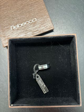 Anillo de la marca Rebecca con un diseño moderno y elegante. - Combinación de colores negro y plateado. - Estilo contemporáneo.