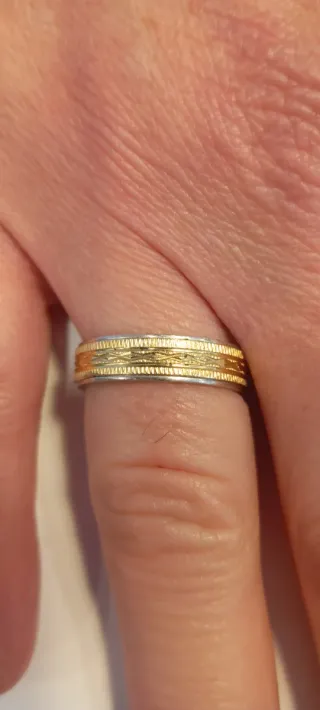 Elegante anillo para mujer con un diseño bicolor que combina oro y plata. Su textura le da un toque único. - Diseño bicolor oro y plata. - Textura detallada en el centro.
