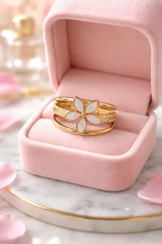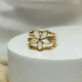 Elegante anillo chapado en oro de 18 quilates con un delicado diseño de flor. - Resistente al agua - Hipoalergénico - Detalle central en la flor. - Diseño de múltiples bandas.