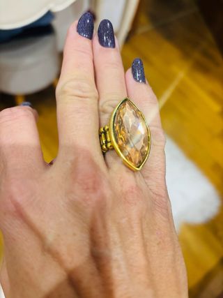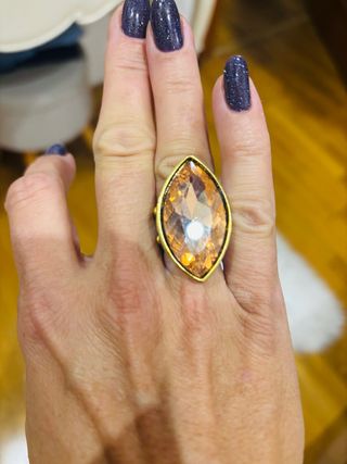 Anillo llamativo con un diseño elegante y moderno. La piedra central de color naranja le da un toque vibrante y sofisticado. - Montura dorada. - Piedra grande con forma de lágrima. - Talla ajustable.