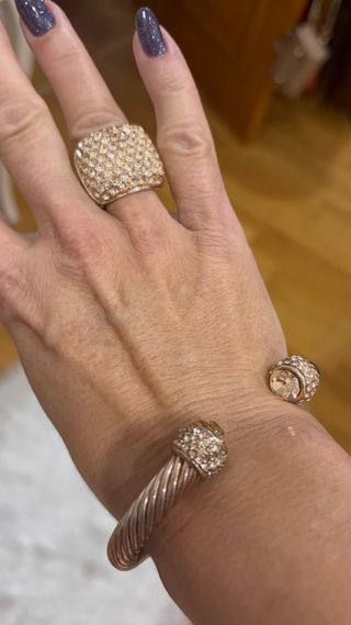 Elegante conjunto de anillo y pulsera. - Diseño con incrustaciones de cristales. - Acabado en tono dorado y plateado.