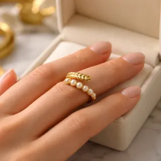 Elegante anillo chapado en oro de 18 quilates con un diseño ajustable. Presenta una hilera de perlas que le otorgan un toque de distinción. - Diseño abierto y adaptable. - Acabado brillante en oro. - Detalle de perlas incrustadas.