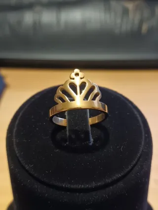 Anillo con diseño de corona. - Fabricado en Acero acabado en oro de 18klt - Hipoalergénico - Resistente al agua y al deslustre. - Totalmente nuevo sin uso - Talla 19.