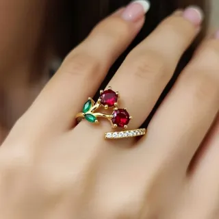 Anillo ajustable con diseño de cerezas y detalles brillantes. - Acero Quirúrgico Chapado en oro de 18 quilates de alta calidad resistente al agua hipoalergénico no pierde el color no se estropea - Dos gemas rojas centrales. - Pequeñas gemas verdes. - Banda adornada con circonitas.