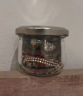 Pequeño tarro con joyas variadas. Pendientes, pulseras, collares, anillos, colgantes... Escríbeme si quieres tarros más personalizados (solo com collares, anillos...) 😊