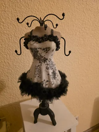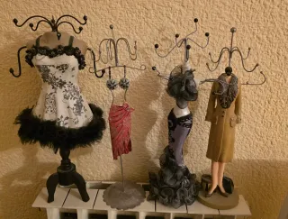 10€ cada uno. Este mini maniquí es perfecto para exhibir tus joyas favoritas, como pulseras o anillos. Su diseño vintage añade un toque de elegancia a cualquier espacio. - Diseño con estampado floral. - Adornado con detalles de encaje y plumas. - Soporte metálico para colgar accesorios. 4 Distintos 10€ cada uno, juntos 35€