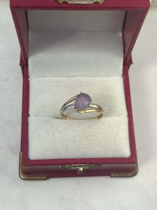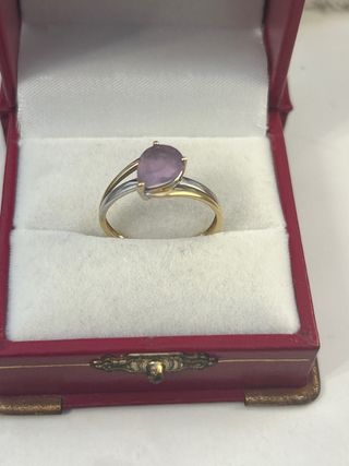 Anillo de oro blanco y oro amarillo de 18kt con amatista en forma de lágrima. Talla 17,5 y peso 2,07g