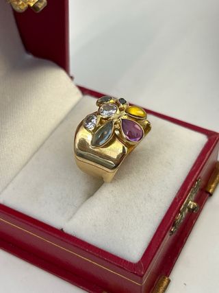Anillo de oro amarillo de 18kt y gemas multicolor. Tiene una parte desoldada pero se puede llevar puesto perfectamente e incluso hace que sea regulable al poderse abrir mas (ver ultima foto). Talla 12,5 y peso 5,81g