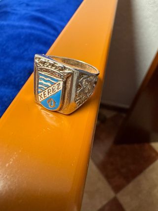 Anillo con el escudo del Xerez CD, comprado el año del ascenso a primera división plata de ley - Diseño con escudo. - Detalles en azul y plata.