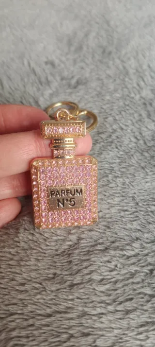 Llavero con diseño de botella de perfume Coco Parfum N°5. - Detalle de brillantes en tono rosa. - Acabado en color oro. - Incluye cadena y anilla para llaves.