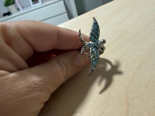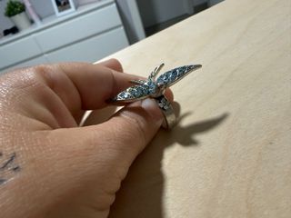 Anillo con diseño de pájaro adornado con pequeñas piedras azules y detalles plateados. - Diseño de pájaro. - Detalles en piedras azules. - Acabado plateado.