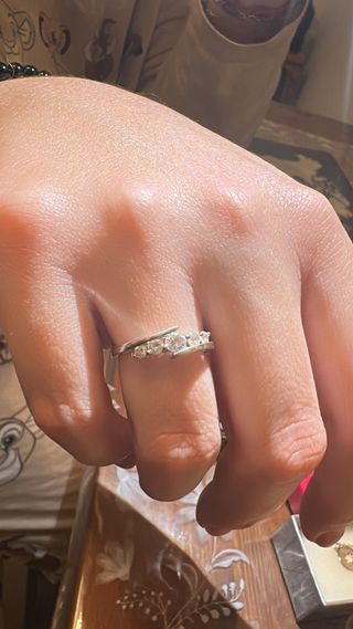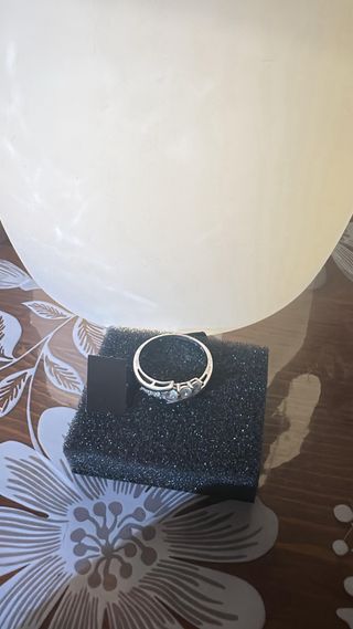 Elegante anillo sin estrenar, con un diseño moderno y delicado. - Cinco circonitas brillantes engastadas. - Banda plateada con un diseño curvo.