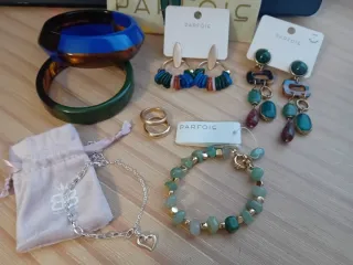 Conjunto de bisutería de la marca Parfois, sin estrenar. - Pulsera de piedras verdes y detalles dorados. - Pendientes largos con piedras - Pendientes de aro con cuentas de colores. - Dos anillos dorados. - Brazaletes de resina (uno azul/marrón y otro verde/marrón). - Pulserita de Briggite Bijou plateada.