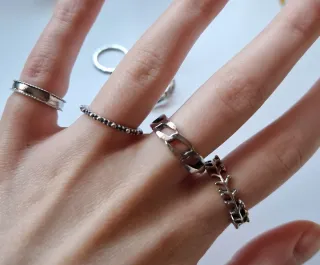 Conjunto de ocho anillos con un diseño moderno y elegante. Son de diferentes tallas - Diseño de eslabones. - Diseño de hoja. - Diseño de bolitas. - Diseño con borde texturizado.