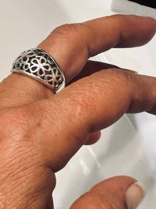 Elegante anillo de plata con un delicado diseño. - Elaborado en plata. - Presenta un patrón calado de flores.