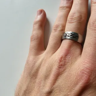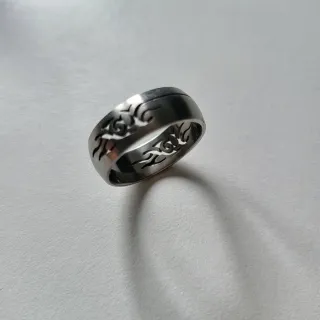 Anillo de acero con un diseño tribal calado. - Material: Acero. - Diseño: Tribal con motivos calados.