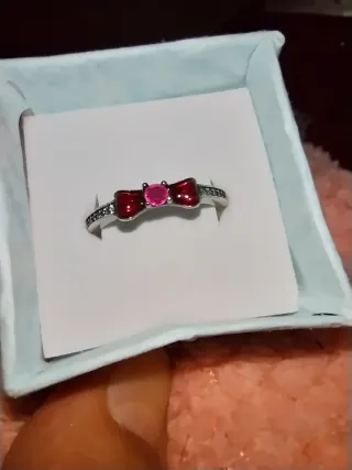 No es de Pandora y no es de marca popular, pero tuve que poner algo. Anillo delicado con un diseño de lazo y una pequeña piedra en el centro. - Color plata. - Piedra de color rojo. -S925