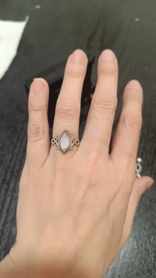 Elegante anillo con una piedra de luna central en forma de marquise. El diseño de la montura es delicado y con detalles. - Montura de plata. - Piedra de luna con brillo iridiscente.