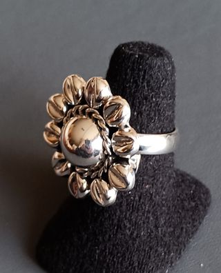 Anillo de plata con un diseño floral único. La pieza central es una esfera pulida, rodeada por pequeñas bolitas texturizadas que simulan pétalos. Diseñado por artesanos mexicanos en plata .925. Diámetro interior: 18,5 mm, ajustable. J660 - Elaborado en plata. - Diseño floral con esfera central. - Detalle de bolitas texturizadas.
