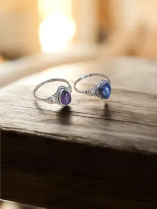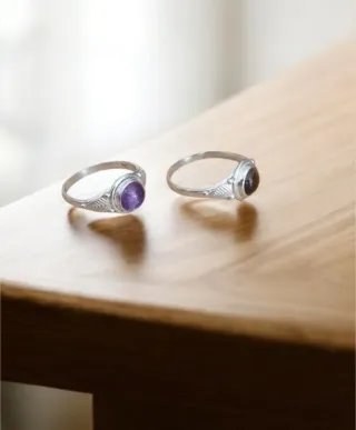 Anillo con dos piedras de amatista natural en bruto. La plata 925 le da un toque elegante y moderno. - Diseño ajustable para mayor comodidad. - Piedras de amatista con tonos púrpuras intensos. - Montura de plata 925.