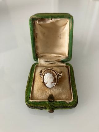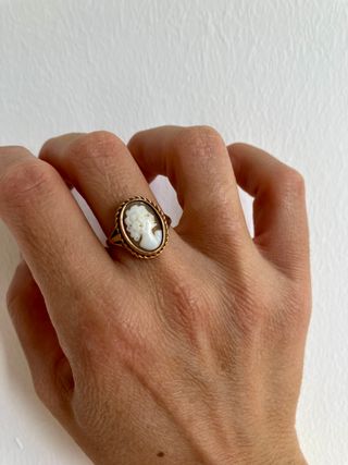 Elegante anillo antiguo con camafeo. Medidas, número de anillo 13 - Montura de oro de 9 quilates. - Diseño clásico de perfil. - Detalle de camafeo en relieve.