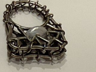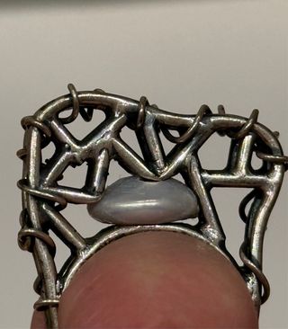 Anillo con un diseño único y una piedra central. - Elaborado con alambre plateado. - Piedra de color gris. perla
