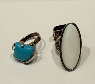 Conjunto de dos anillos con piedras llamativas. - Un anillo con una piedra turquesa cuadrada. - Otro anillo con una piedra blanca ovalada.