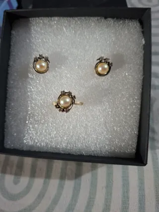 Precioso conjunto de joyería antigua compuesto por pendientes de plata y perla original y anillo de plata y perla original. - Elaborado en plata. - Diseño delicado con perlas.