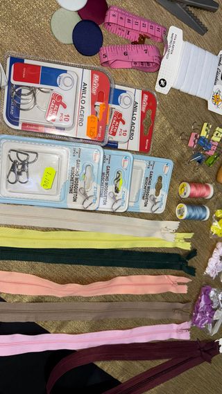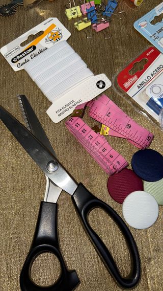 Kit de costura con varios elementos esenciales. - Tijeras de corte con filo dentado. - Rollo de cinta elástica blanca de 10mm x 3m. - Cinta métrica flexible de 150cm. - Anillos de acero. - Círculos de tela decorativos en varios colores.