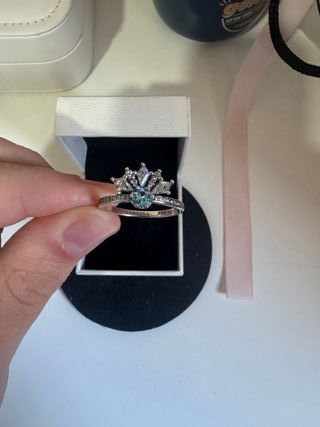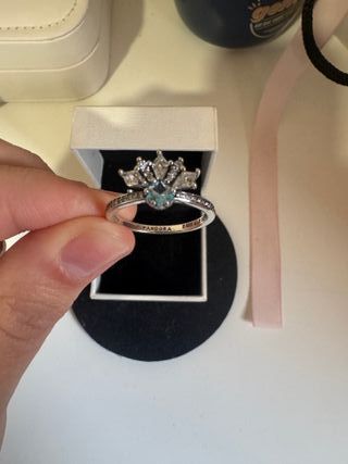 Anillo inspirado en la princesa Elsa de Frozen, con un diseño elegante y detalles brillantes. - Elaborado en plata de ley 925. - Diseño con forma de corona y piedras azules y transparentes.