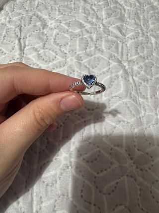 Elegante anillo con un diseño de corazón azul brillante y detalles plateados. - Forma de corazón. - Piedra central azul. - Banda con pequeñas incrustaciones.