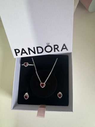 Elegante conjunto de joyas Pandora con diseño de corazón. -Incluye la caja - Incluye collar, anillo y pendientes. - Elaborado en plata 925. - Detalle de circonitas brillantes.