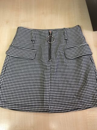 Falda corta con estampado de cuadros. - Diseño con cremallera frontal y detalle de anilla. - Bolsillos decorativos en la parte superior.