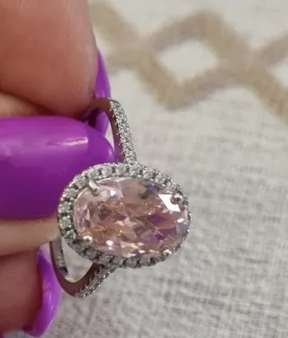 Elegante anillo de plata de ley 925 con una circonita rosa central de corte ovalado. El aro está adornado con pequeñas circonitas que aportan brillo adicional. - Material: Plata de ley 925. - Gema principal: Circonita rosa ovalada. - Detalles: Circonitas incrustadas en el aro. _ Talla 10 mide de diámetro 20 mm