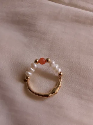 Anillo de acero con baño dorado y piedras naturales de cornalina y perlas. Es elástico (ajustable)