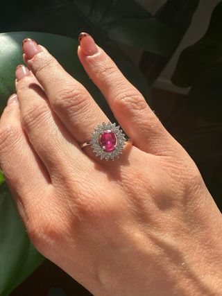 Elegante anillo con un rubí central y pequeños diamantes a los lados. - Diseño ovalado del rubí. - Detalles de diamantes brillantes. - No usado