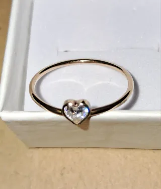 Anillo dorado con forma de corazón. Es de bisutería, no se de qué metal. No se ha usado nunca, está nuevo. No se que talla es pero a mi me va perfecto y tengo los dedos un poco gorditos. He puesto una talla aproximada midiendo mi dedo pero puede no ser correcta.