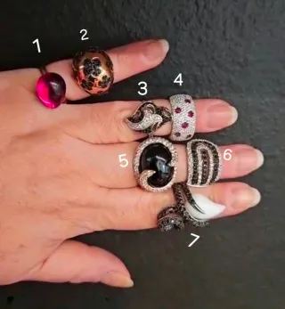 Conjunto de anillos de plata rodiada de estilo italiano, modernos. - Diseño con piedras naturales: Onyx, marcasitas y cristal swarosvsky, esmaltes.. - Acabado plateado brillante brillante -Hay 1ud chapada en oro rosa -En las fotos se ve la talla exacta de cada anillo pero si necesitan una foto de alguno pedirlo por mensaje privado ● SON RESTOS DE UNA JOYERÍA QUE HA CERRADO