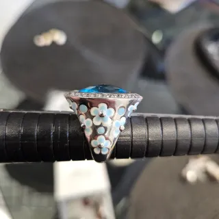 Elegante anillo italiano con una llamativa piedra azul central. El diseño se complementa con pequeños detalles brillantes a los lados. - Elaborado en plata. - Piedra central de color azul intenso. (Cristal Swarosvsky) - Diseño con incrustaciones en cristal Swarosvsky blanco y flores esmaltadas.