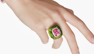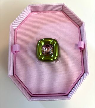 Anillo Swarovski modelo Dulcis con un diseño llamativo. - Color principal verde con detalles en rosa. - Presentado en su caja original - Es una talla 58 por el tallaje de Swarovski. - Es la primera edicion de Dulcis, mayor tamaño y consistencia que el actual modelo.
