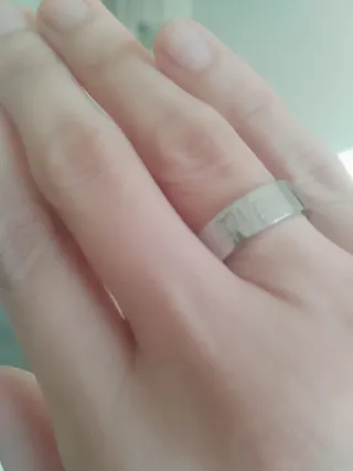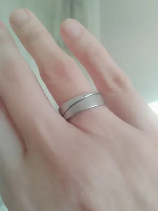 Anillo, efecto rayado, chapado en plata e hipoalergénico. Talla 14, pero al ser abierto, se puede ajustar dos números más, menos.