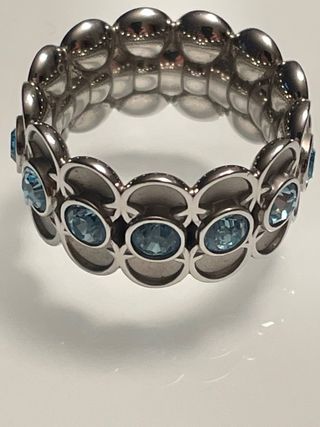 Anillo con piedra de colores. Brillan cuando le da la luz. Mide 18mm de diámetro interior. En muy buen estado, poco uso. Desconozco el material pero no mancha la piel.