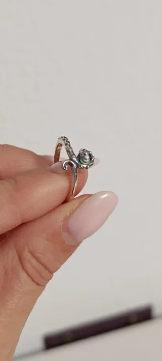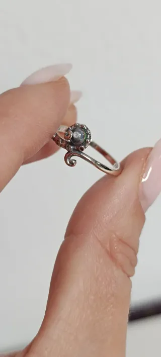Anillo Úrsula de La Sirenita de Disney x Pandora. Este anillo está diseñado en plata de primera ley y presenta detalles intrincados que se asemejan a los tentáculos de la villana Úrsula, con una circonita cúbica azul claro que representa el colgante de concha de mar que lleva en la película. Talla 56