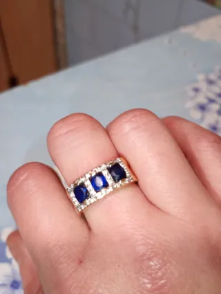 Elegante anillo con un diseño clásico y llamativo. - Montura de oro. - Tres zafiros azules centrales. - Circonitas incrustadas a los lados.