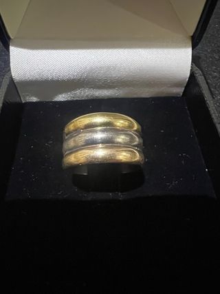 Anillo con un diseño tricolor que combina oro y plata. Una pieza elegante y versátil. - Diseño de tres bandas. - Combinación de metales preciosos.