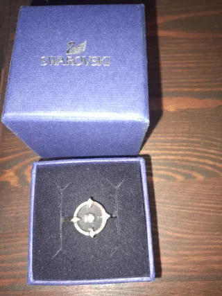 Elegante anillo de la marca Swarovski. - Diseño circular con detalles en negro y plateado. - Centro con una pequeña gema o cristal.