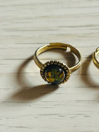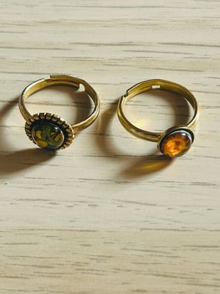 A la venta este par de anillos con diseño de cabujón. Ideales para regalo o para complementar un estilo bohemio/vintage. • Material: Metal color bronce envejecido. • Diseño: Uno con ilustración de sol radiante y otro con figura gráfica estilizada. • Talla: Única (son ajustables, se pueden abrir o cerrar con cuidado). • Estado: Nuevos / Excelente estado.