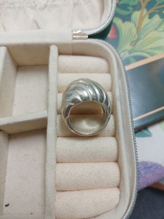 Anillo llamativo con un diseño texturizado. - Acabado plateado. - Diseño inspirado en cuerdas o trenzas. - Forma redonda y abultada.